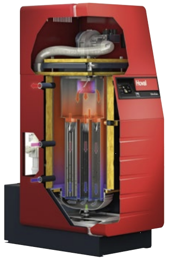 Caldaia a condensazione a gas per riscaldamento e produzione di acqua calda sanitaria con minimi costi di esercizio. A pavimento, adattamento in continuo della potenza, idonea per gas rinnovabili (idrogeno e biometano), con regolazione di sistema Hoval TopTronic®